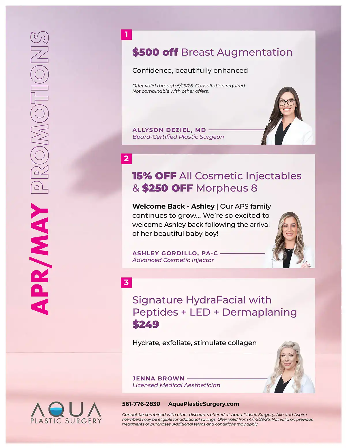 * Cannot be combined with other discounts offered at Aqua Plastic Surgery. Alle and Aspire members may be eligible for additional savings. Offer valid from 4/1-5/29/26. Not valid on previous treatments or purchases. Additional terms and conditions may apply