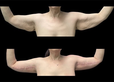 Dr. Deziel performed an arm lift surgery to remove this patient’s excess skin and improve her upper arm definition, resulting in more toned upper arms from the front and back, in just three weeks.